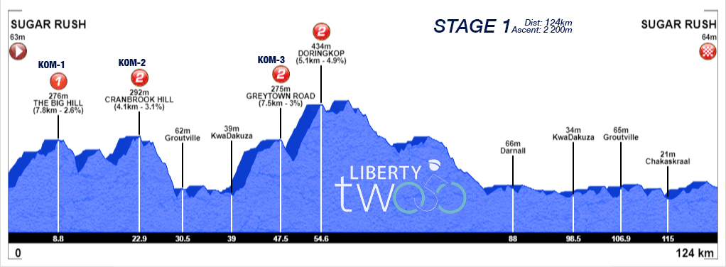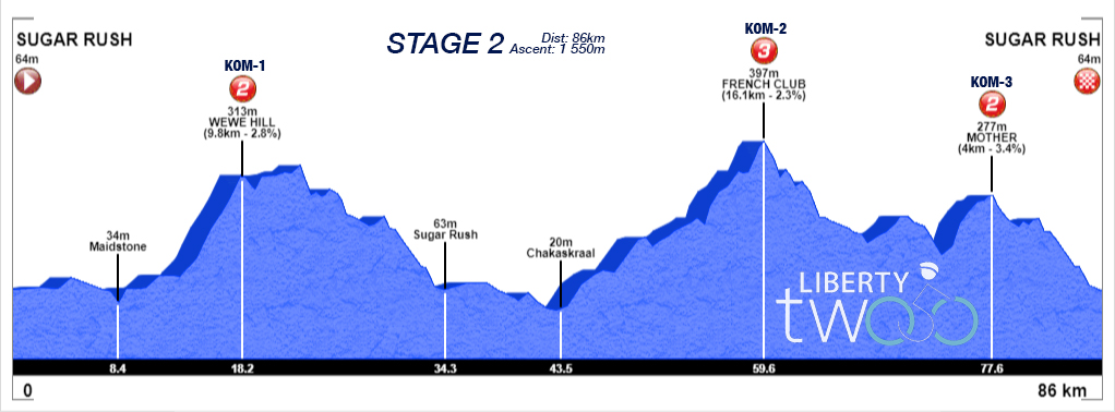 The Liberty 250 traverses the rolling hills of the farm lands inland from Ballito on the North Coast of Kwazulu Natal. Starting and finishing at Sugar Rush Park on the Esenembe Road the routes over the three days take in spectacular scenery and give the climbers plenty of opportunities to show their skills. The King of the Mountain climbs are balanced by some dramatic descents and fast undulating sections with a sprint prize on Day Three.