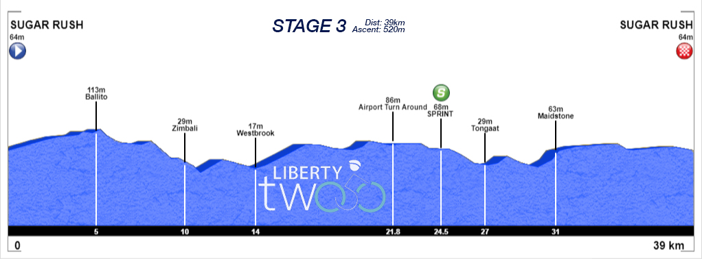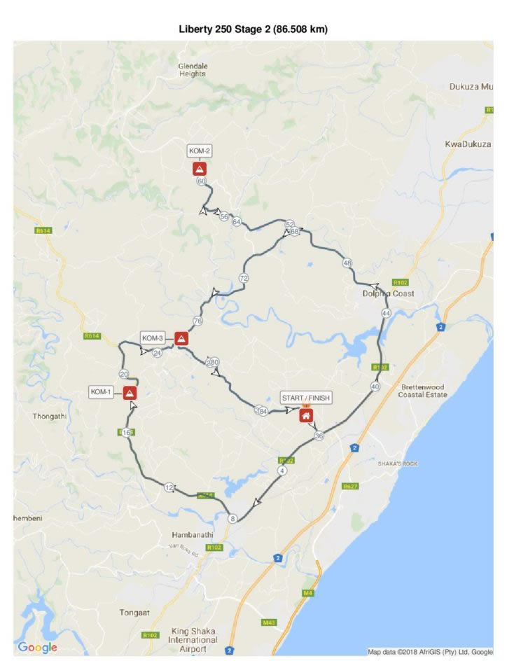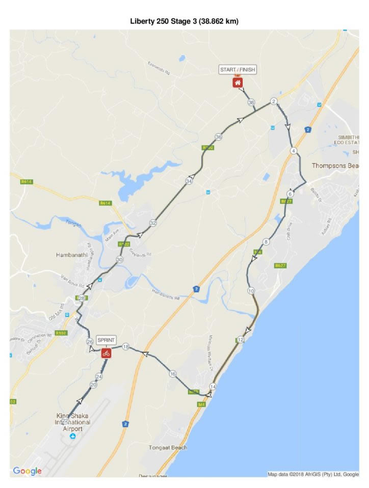 Stage 3 will be fast and furious with the route exiting the start east and heading through Ballito and onto the M4 Coastal highway. It will be very fast down past Zimbali before the route turns right off the M4 and up the Watson Highway and under the N2 Highway. Turning left off the Watson Highway is the flat section before the airport. Turning at the top, the return trip to the Watson Highway features the Sprint Hot Spot for the day. The route returns to Sugar Rush Park along the R102.
