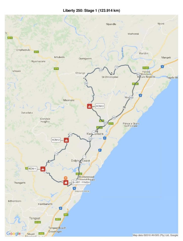 From the start at Sugar Rush Park the route heads west on the Esenembe road and immediately starts the climb known as the Big Hill. With 8km to the top, this is the first King of The Mountain hot spot of the event. At the top the route turns right past Rain Farm and the Peaking Power Station before the Cranbrooke climb which is the second KOM. Down through Groutville and left onto the R102 to Kwadukuza (Stanger)